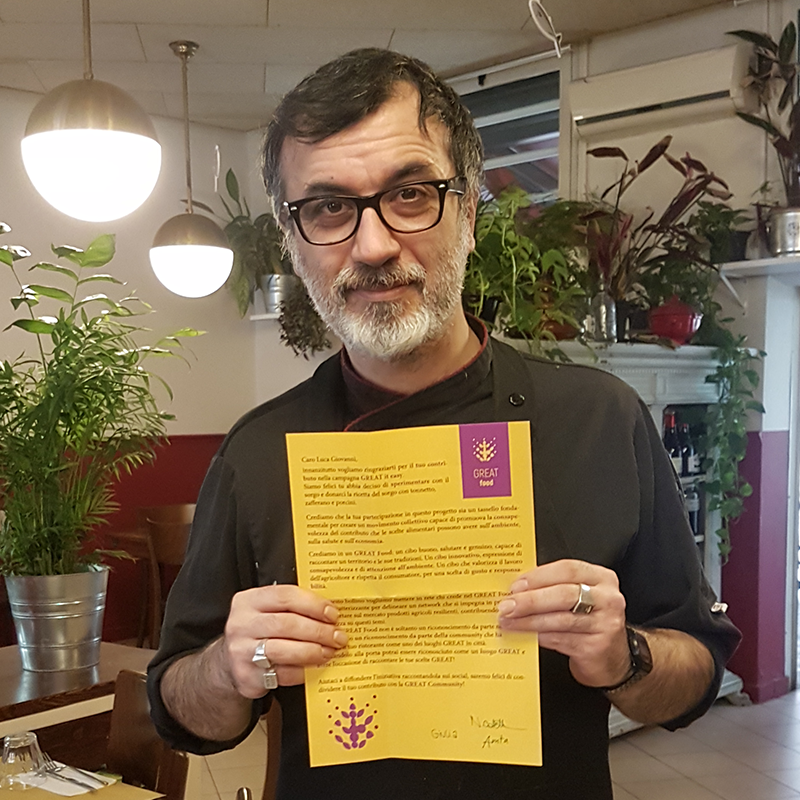 Con questa vetrofania pensata per essere attaccata sulle vetrine dei ristornate degli chef abbiamo voluto mettere in rete chi crede nel GREAT Food: un segno caratterizzante per delineare un network che si impegna direttamente a usare e diffondere prodotti resilienti, contribuendo alla consapevolezza su questi temi.