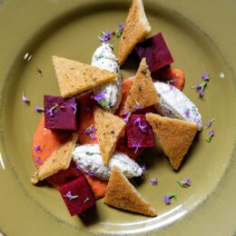 Farinata di miglio con crema di pomodorini arrostiti, ricotta al basilico e rapa rossa agrodolce | Estravagario